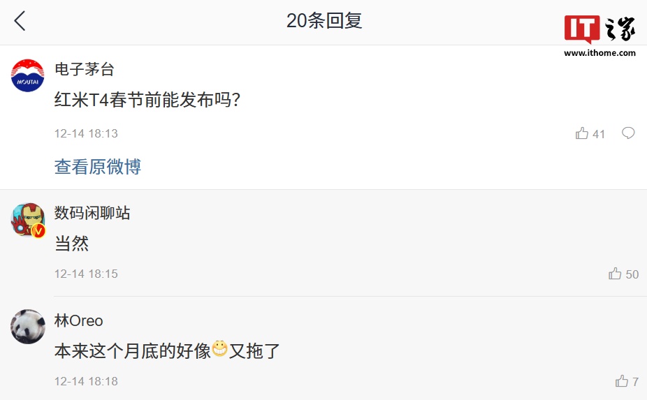 该名博主在自己另外一条微博的评论区中回复了网友关于 REDMI Turbo 4 手机的发布情况,针对该机春节前能不能发布,他回复称“当然”。