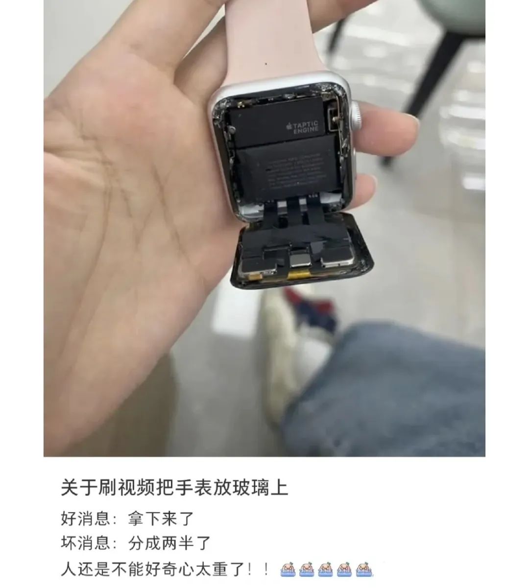 先是有帖子劝大家不要尝试,因为当手表粘上玻璃后,想要拿下来并不是那么容易。后来更是有人发帖附上了手表表面脱落的照片。