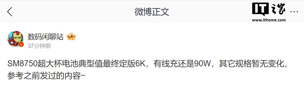 IT之家 12 月 16 日消息,博主 @数码闲聊站 今日透露,SM8750(骁龙 8 至尊版)超大杯电池典型值最终定版 6K,有线充还是 90W。