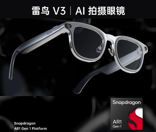 雷鸟 V3 AI 拍摄眼镜由雷鸟与博士眼镜联合研发,搭载高通骁龙 AR 1 芯片、高精度摄像头,以及多模态 AI,为用户带来舒适、高效的 AI 智能化体验,产品预计在 2025 年一季度推出正式发布。