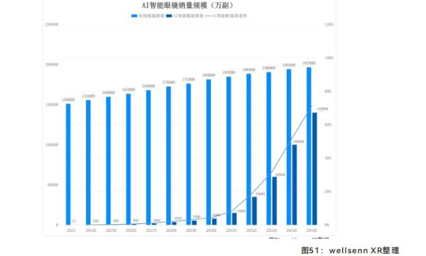 根据wellsenn XR数据,2023年全球眼镜销量约15.6亿副;预测10年后,全球眼镜销量将达20亿副左右;2025年开始,AI智能眼镜将在传统眼镜销量保持稳定增长的大背景下快速向传统眼镜渗透;2029年,AI智能眼镜年销量有望达到5500万副;到2035年,AI智能眼镜销量有望达14亿副。