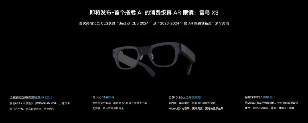 得益于工艺改良、波导设计和关键算法上的突破,新一代AR眼镜雷鸟X3整机重量将下降至约60g,续航时间较上一代提升了近一半,而入眼显示亮度提高了一倍以上。