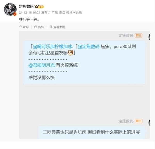 因此,很多人期待华为Pura 80系列发布时能用上这项技术,但根据博主“定焦数码”的最新消息,Pura 80系列暂时无缘低轨卫星互联网。