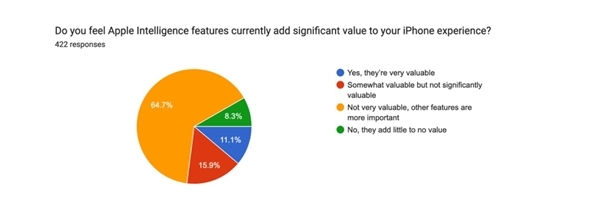 调查报告指出,虽然iPhone用户想要体验到AI功能,但是73%的iPhone用户认为目前Apple Intelligence的功能不是很有价值,甚至几乎没有价值。