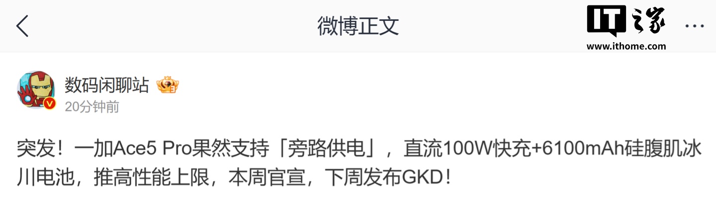 IT之家 12 月 17 日消息,博主 @数码闲聊站 今日透露,一加 Ace 5 Pro 手机支持“旁路供电”,直流 100W 快充 + 6100mAh 硅负极冰川电池。此外这款手机将于本周官宣、下周发布。