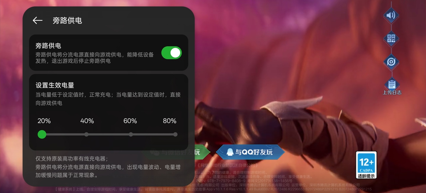该功能可设置生效电量,当电量低于设定值时,正常充电;当电量达到设定值时,直接向游戏供电。仅支持原装高功率有线充电器。