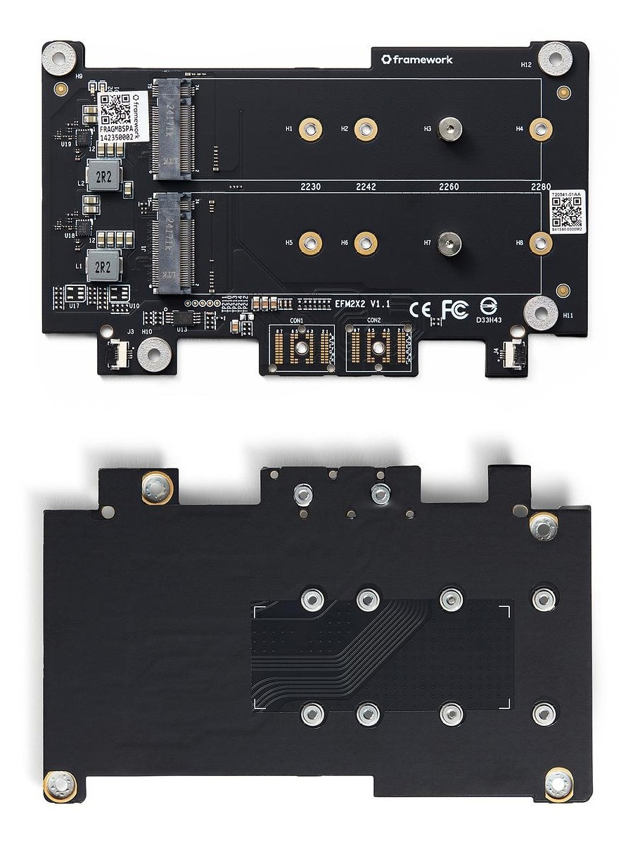 该双 M.2 盘位适配器提供了 2 个支持 PCIe 4.0×4 的 M.2 M-Key 2230 / 2242 / 2260 / 2280 盘位,采用 Framework 重定义的 PCIe 4.0×8 DGFF 接口(IT之家注:适配器底部中间可见一对 DGFF 连接器)同主板连接。