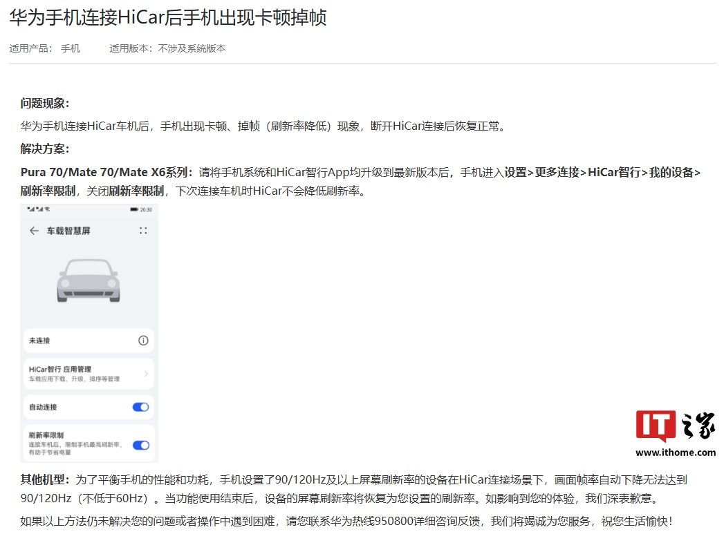 IT之家注意到,官网显示其他机型为了平衡性能和功耗,手机设置了 90/120Hz 及以上屏幕刷新率的设备在 HiCar 连接场景下,画面帧率自动下降无法达到 90/120Hz(不低于 60Hz)。当功能使用结束后,设备的屏幕刷新率将恢复为设置的刷新率。
