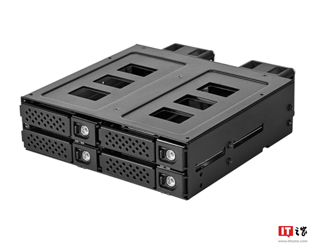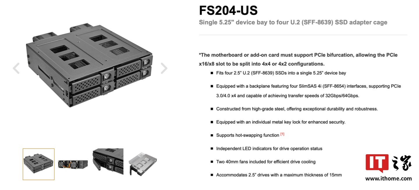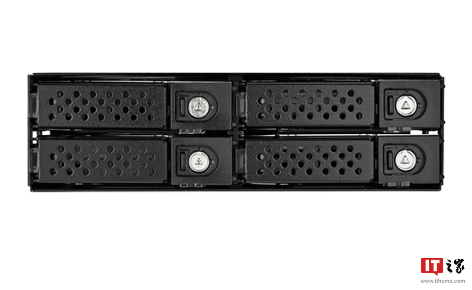 该机整体尺寸为 146x159x42 毫米,重量为 640 克,占用一个 5.25 英寸光驱仓位,其可容纳 4 块 2.5 英寸 U.2 SSD,支持热插拔 / 免工具安装,同时也配有防盗锁。