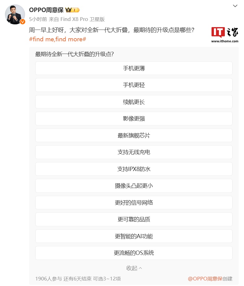 IT之家 12 月 17 日消息,OPPO Find N5 折叠屏手机目前已开启早期预热,OPPO Find 系列产品负责人周意保昨日发布“投票”,询问用户对于全新一代大折叠手机最期待的升级点,同时透露了全新一代大折叠屏手机发布时间为“春暖花开的季节”。