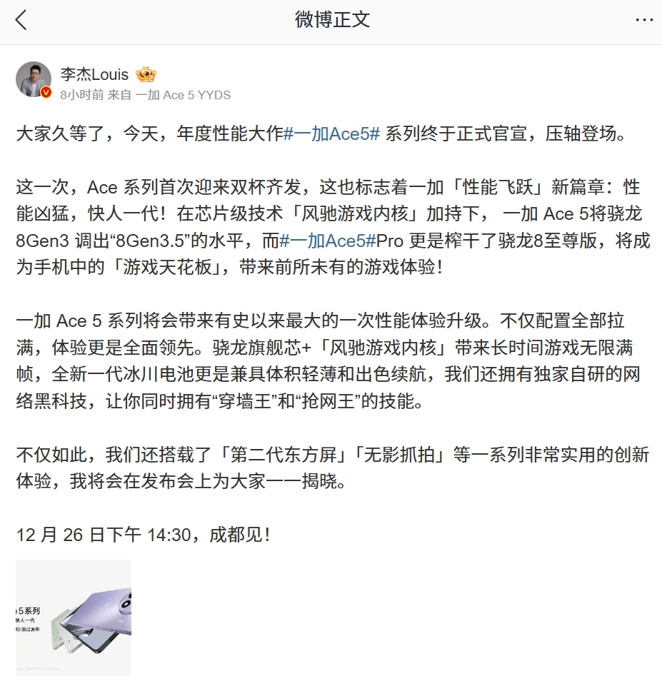 据IT之家今日早些时候报道,一加中国区总裁李杰发文称:Ace 系列首次迎来双杯齐发,这也标志着一加“性能飞跃”新篇章。在芯片级技术“风驰游戏内核”加持下,一加 Ace 5 将骁龙 8Gen3 调出“8Gen3.5”的水平,而一加 Ace 5 Pro 更是“榨干了骁龙 8 至尊版”,将成为手机中的“游戏天花板”。