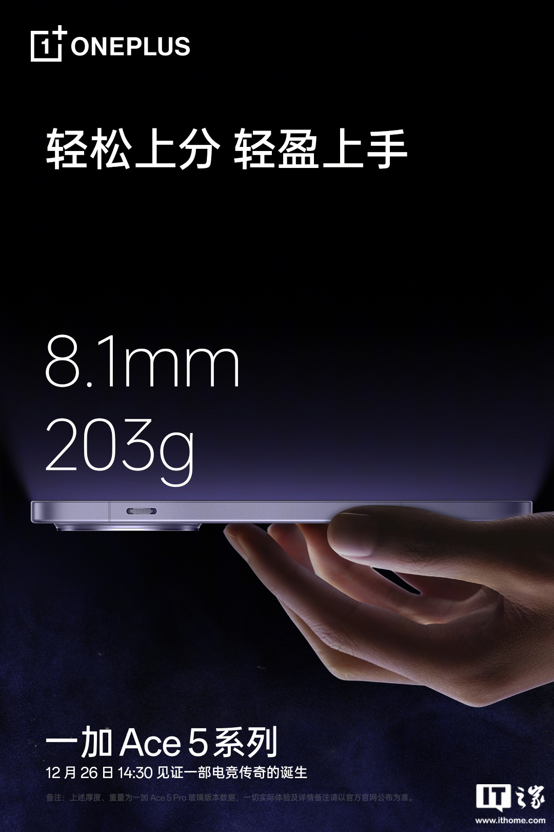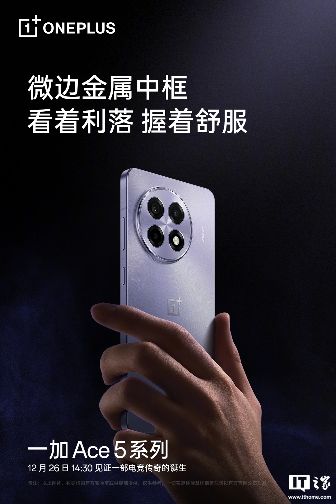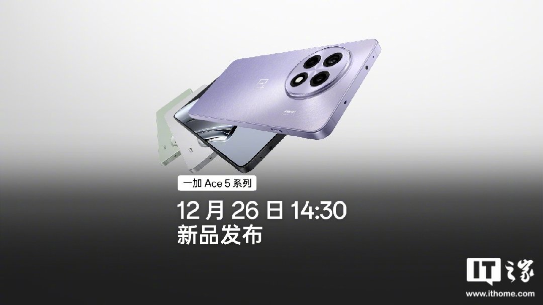 IT之家 12 月 19 日消息,一加 Ace 5 系列手机发布已官宣定档 12 月 26 日 14:30,同时还将带来一加平板、一加 Buds Ace 2 无线耳机。