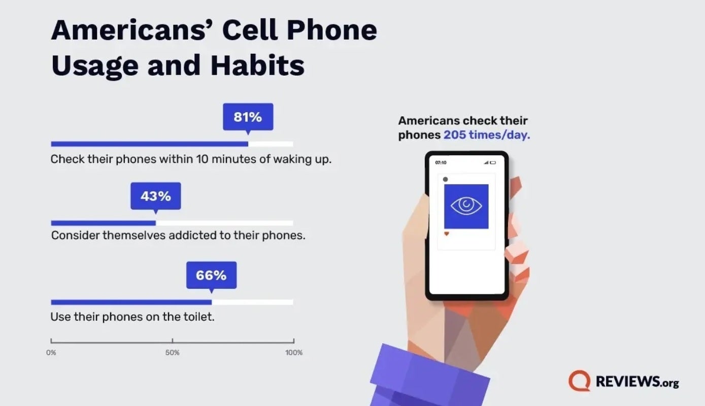 去年,美国人平均每天查看手机 144 次。这意味着与去年相比,美国人今年查看手机的频率增加了 42.3%。