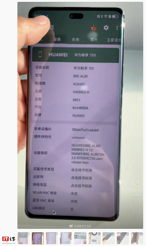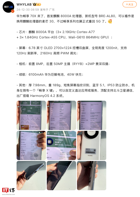 IT之家 12 月 30 日消息,华为畅享 70X 手机爆料消息近期不断,目前博主 @WHYLAB 直接公布了这款手机的大部分规格信息及设备照片,该机型号 BRE-AL80,据称“可以看作是换用麒麟处理器的麦芒 30 手机”。