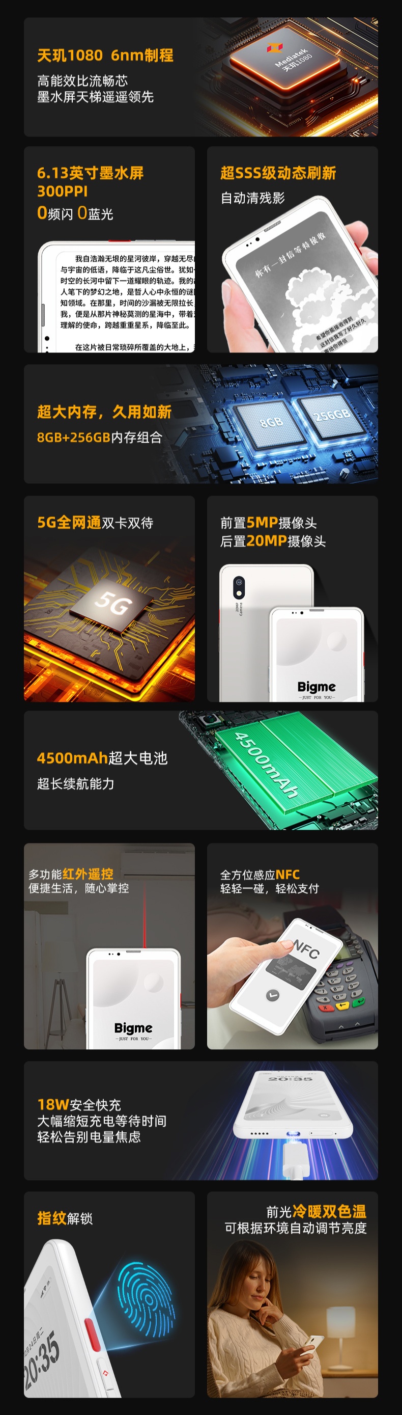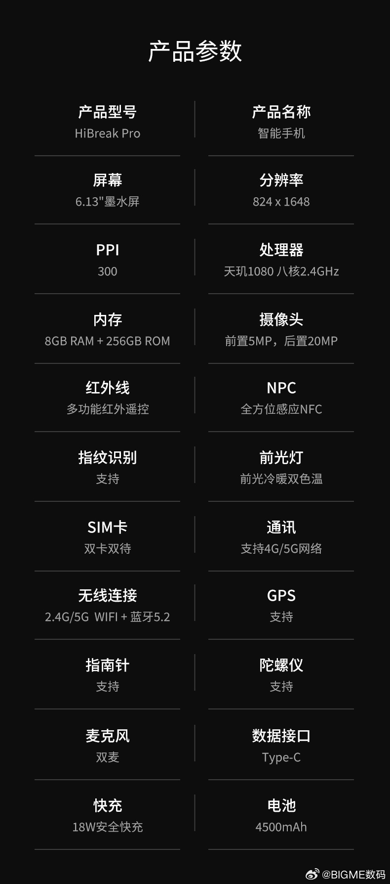 HiBreak Pro 墨水屏手机搭载天玑 1080 处理器、6nm 制程工艺,8GB+256GB 组合;6.13 英寸墨水屏、300PPI,0 频闪、0 蓝光;前置 5MP 摄像头,后置 20MP 摄像头;4500mAh 电池,支持 18W 充电;搭载安卓 14 开放系统,支持红外遥控、NFC、GPS 定位、侧边指纹解锁。