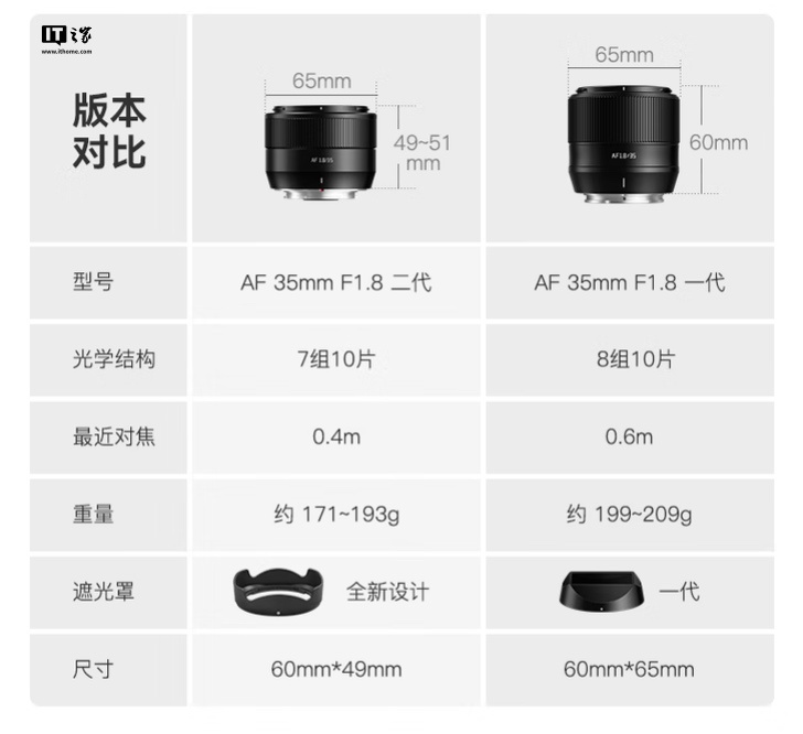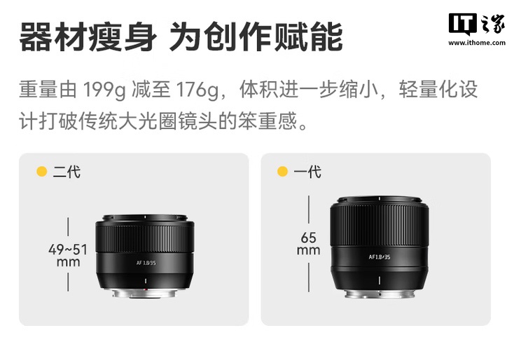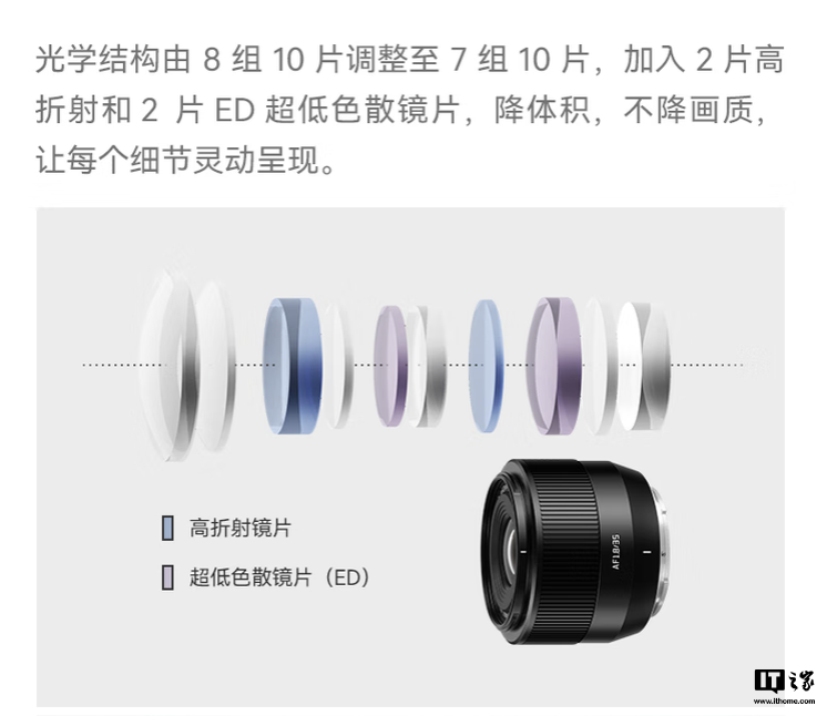 据官方介绍,这款镜头体积重量进一步缩减初代,等效全画幅 53mm,光学结构从初代的 8 组 10 片改为 7 组 10 片。