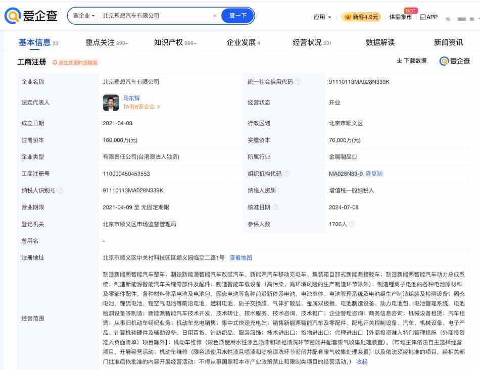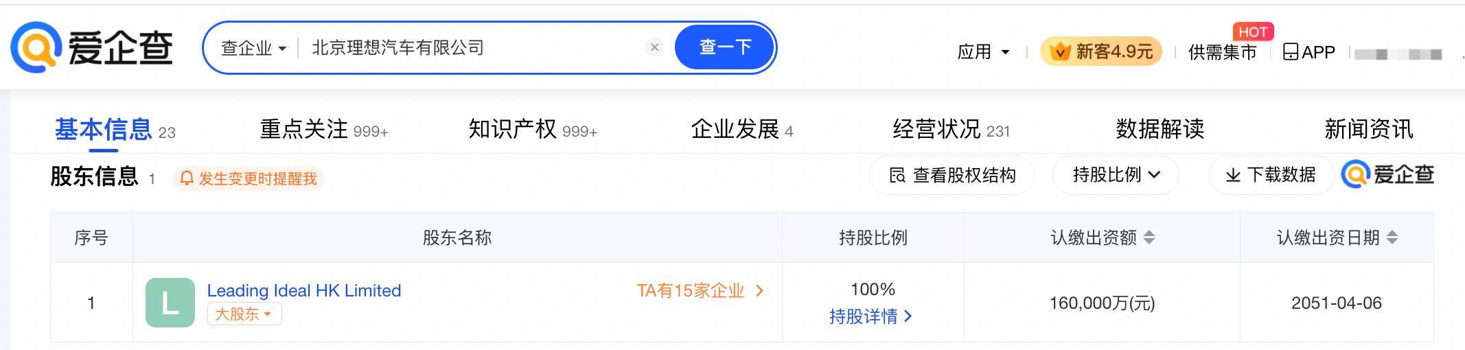 北京理想汽车有限公司成立于2021年4月,法定代表人为马东辉,注册资本16亿元人民币,由Leading Ideal HK Limited全资持股。