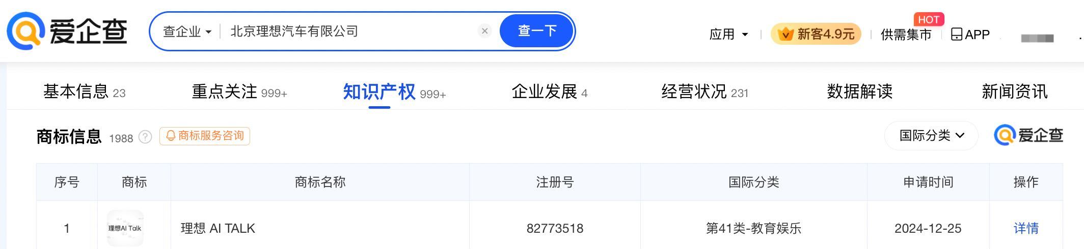 凤凰网科技讯 1月20日,爱企查App显示,近日,北京理想汽车有限公司申请注册一枚“理想AI Talk”商标,国际分类为教育娱乐,当前商标状态为等待实质审查。