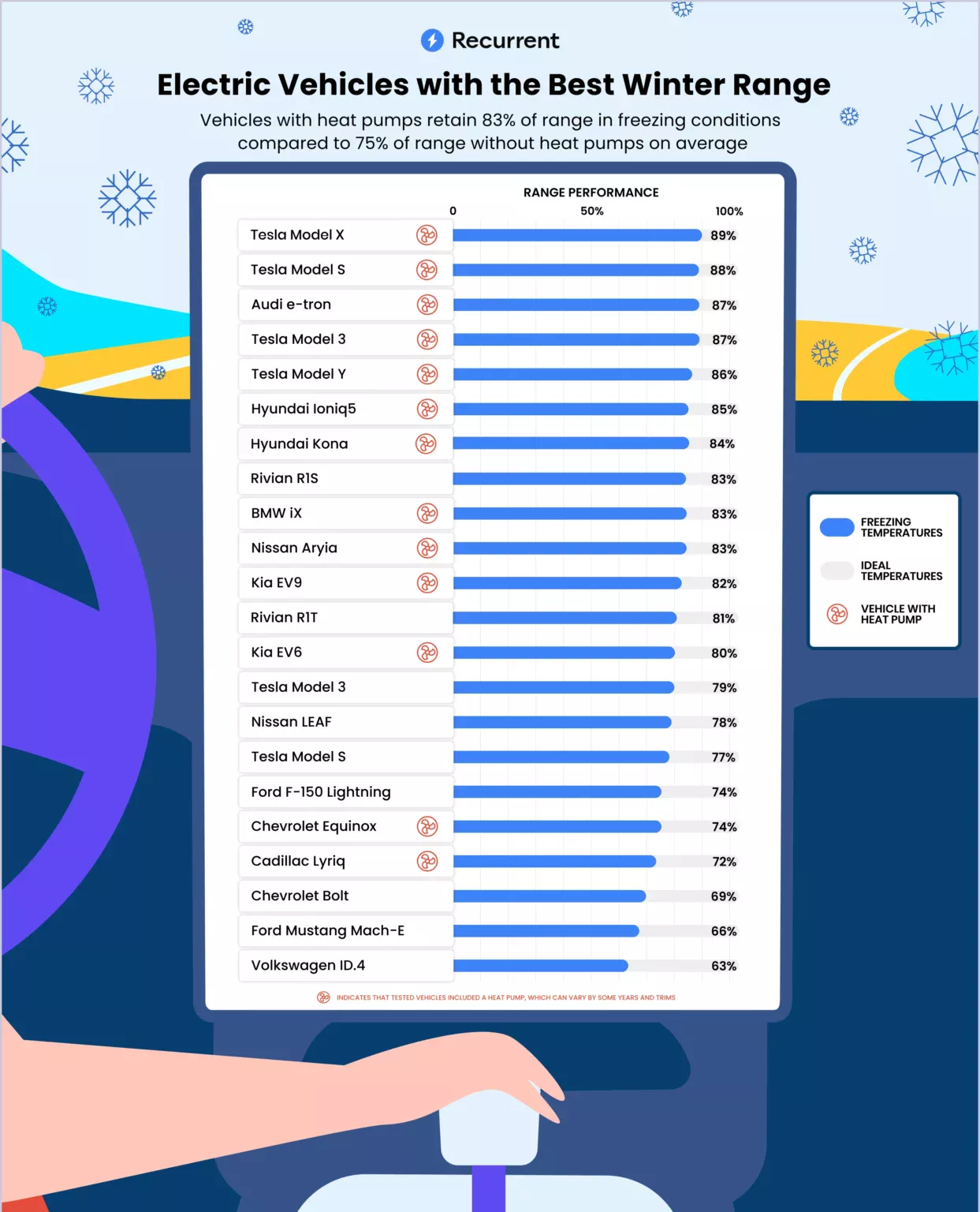 研究机构 Recurrent 通过分析美国市场上 20 款主流电动车的超过 18000 辆样本,计算出各车型在低温环境下的续航损失情况。特斯拉 Model X 表现最佳,仍能保持 89% 的续航,其次是特斯拉 Model S(88%)。