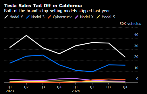 尽管特斯拉去年在其产品阵容中增加了第五款车型 —— 引起两极分化的Cybertruck,但登记数量仍出现了下跌。虽然更常见的商业因素也发挥了作用,包括年初Model 3系列的升级,但公司也可能因为其首席执行官埃隆·马斯克在美国大选中所扮演的活跃角色而失去了在加州的部分业务。