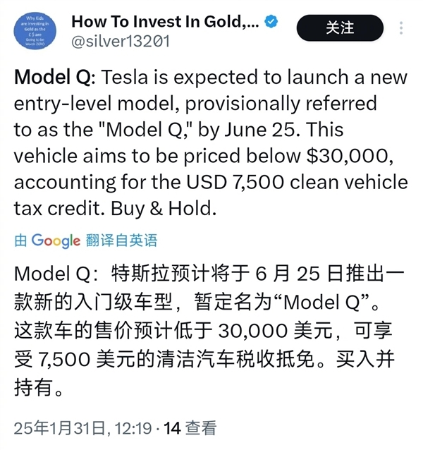 快科技2月3日消息,近日有海外博主爆料,特斯拉全新入门纯电动车Model Q将于今年6月25日发布,预计售价低于30000美元,并且在美国还可享受7500美元的免税政策。