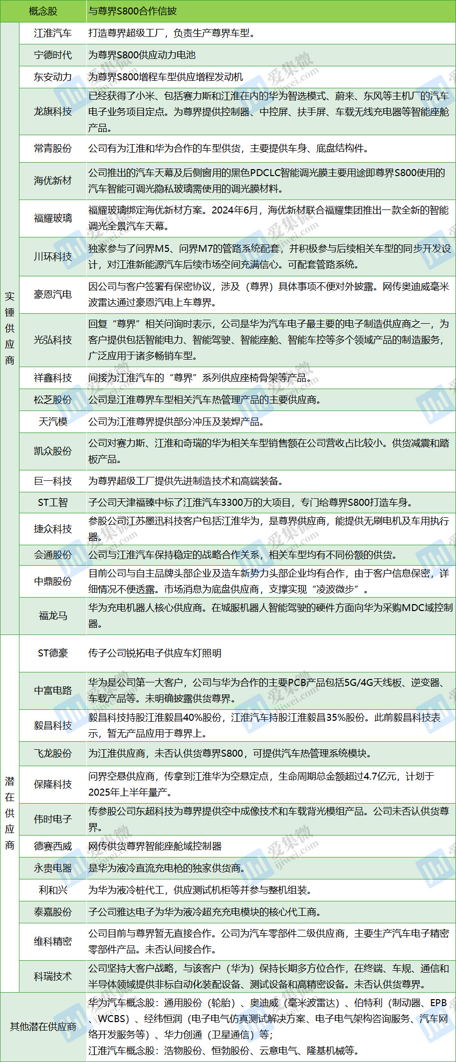 ST德豪、中富电路、飞龙股份、保隆科技、伟时电子、德赛西威、永贵电器、利和兴、泰嘉股份、维科精密、科瑞技术、通用股份、奥迪威、伯特利、经纬恒润、华力创通等华为汽车概念股/卫星通信概念股部分预计也会成为尊界供应商。