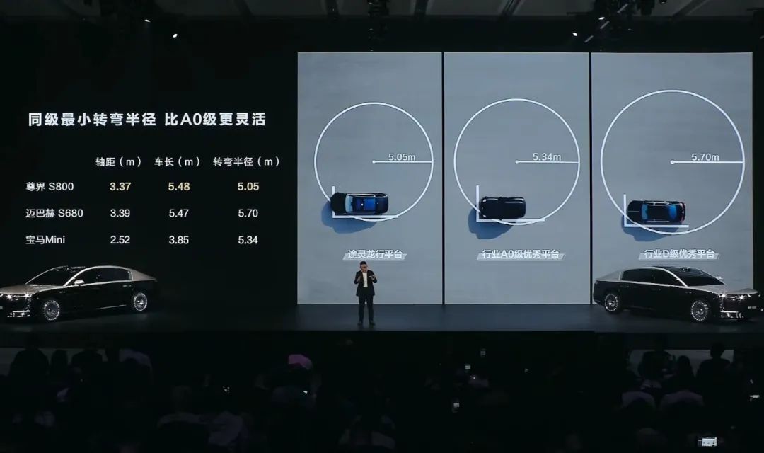 这就好比给人安上了一套更强韧的神经+小脑,能够如臂使指,灵活自如地手脚并用、眼观八方,让人如同运动高手一般协调灵敏,而不是遇到一个稍大的坡就爬不动、路稍微滑点就会摔倒。在发布会上展示的时速120公里爆胎测试中,尊界S800仍能保持直行,是行业内唯一能在这样的高速状况下保持稳定的;在冰雪、湿滑路面,也能做到不打滑。就连体现车辆灵活性的最小转弯半径,也做到了远小于迈巴赫S680,甚至比Mini还小。
