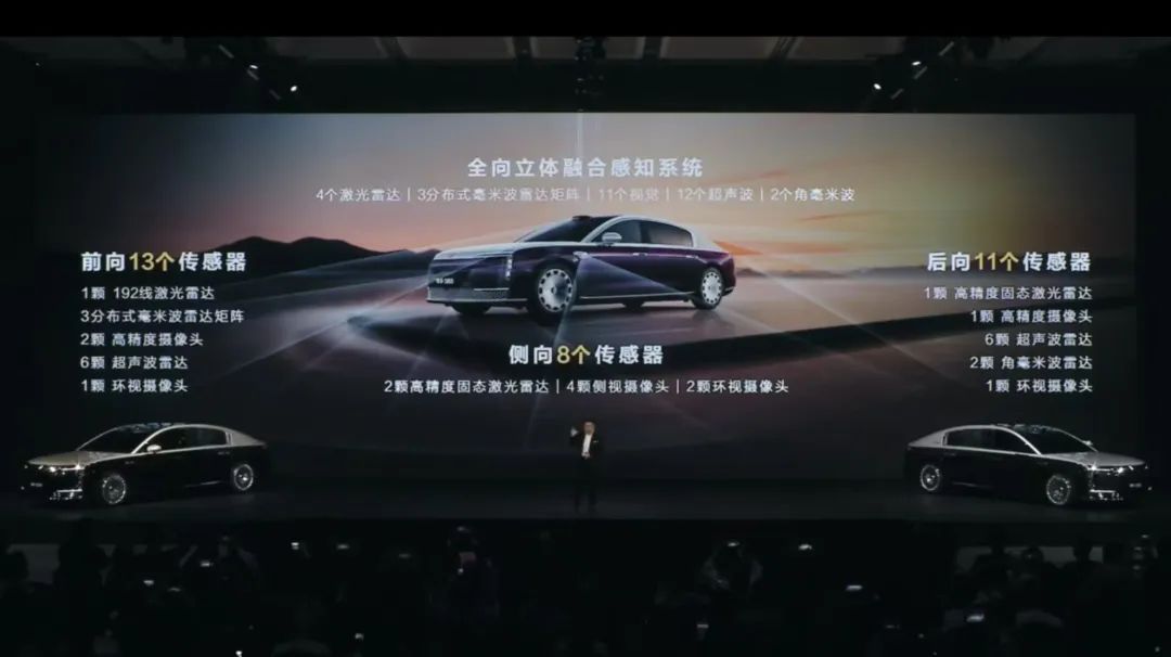 在硬件上,这个形容确实没毛病:尊界S800会搭载多达4颗激光雷达,全车共配备前向13个、侧向8个、后向11个传感器,构成全向立体感知系统。搭载如此多的感知设备,其能力已经远远超出了当前L2级别智能驾驶的需要,为更高级别的智能驾驶留足了足够的硬件冗余。