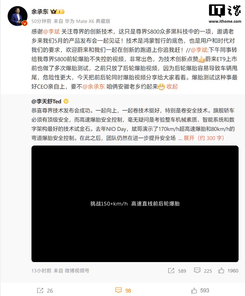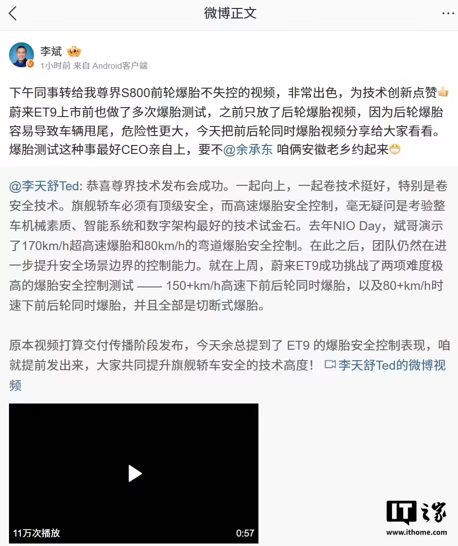 昨日,蔚来产品副总裁李天舒分享了 ET9 轿车“挑战 150+km/h 高速直线前后轮爆胎”视频,蔚来创始人、董事长、CEO 李斌转发了该视频,表示爆胎测试这种事最好 CEO 亲自上,并喊话华为常务董事、终端 BG 董事长、智能汽车解决方案 BU 董事长余承东一起测试。