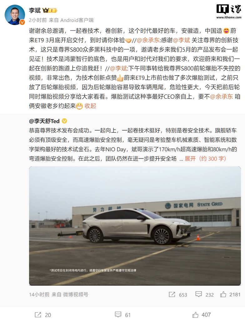 IT之家 2 月 21 日消息,蔚来创始人、董事长兼 CEO 李斌今日回应了华为常务董事、终端 BG 董事长、智能汽车解决方案 BU 董事长余承东的邀请:“谢谢余总邀请,一起卷技术,卷创新,这个时代最好的车,安徽造,中国造。蔚来 ET9 3 月底开启交付,到时请你体验!”