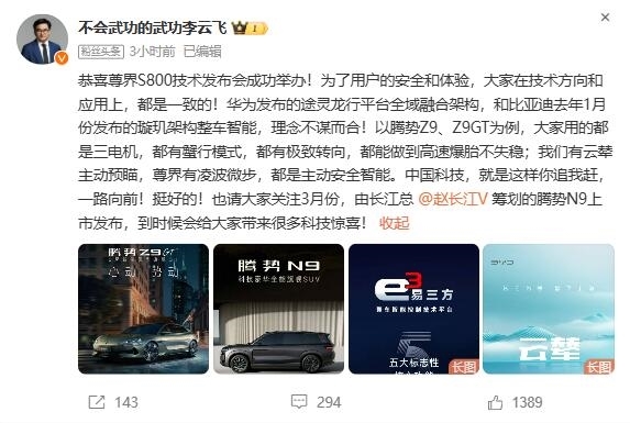以腾势Z9、Z9GT为例,大家用的都是三电机,都有蟹行模式,都有极致转向,都能做到高速爆胎不失稳;比亚迪有云辇主动预瞄,尊界有凌波微步,都是主动安全智能。中国科技,就是这样你追我赶,一路向前。挺好的!也请大家关注3月份,由长江总筹划的腾势N9上市发布,到时候会给大家带来很多科技惊喜。