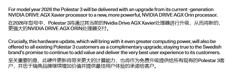 IT之家 2 月 21 日消息,极星汽车宣布,将为 2026 款极星 3 配备全新的 NVIDIA DRIVE AGX Orin 处理器,并且这一硬件升级也将惠及现有车辆。
