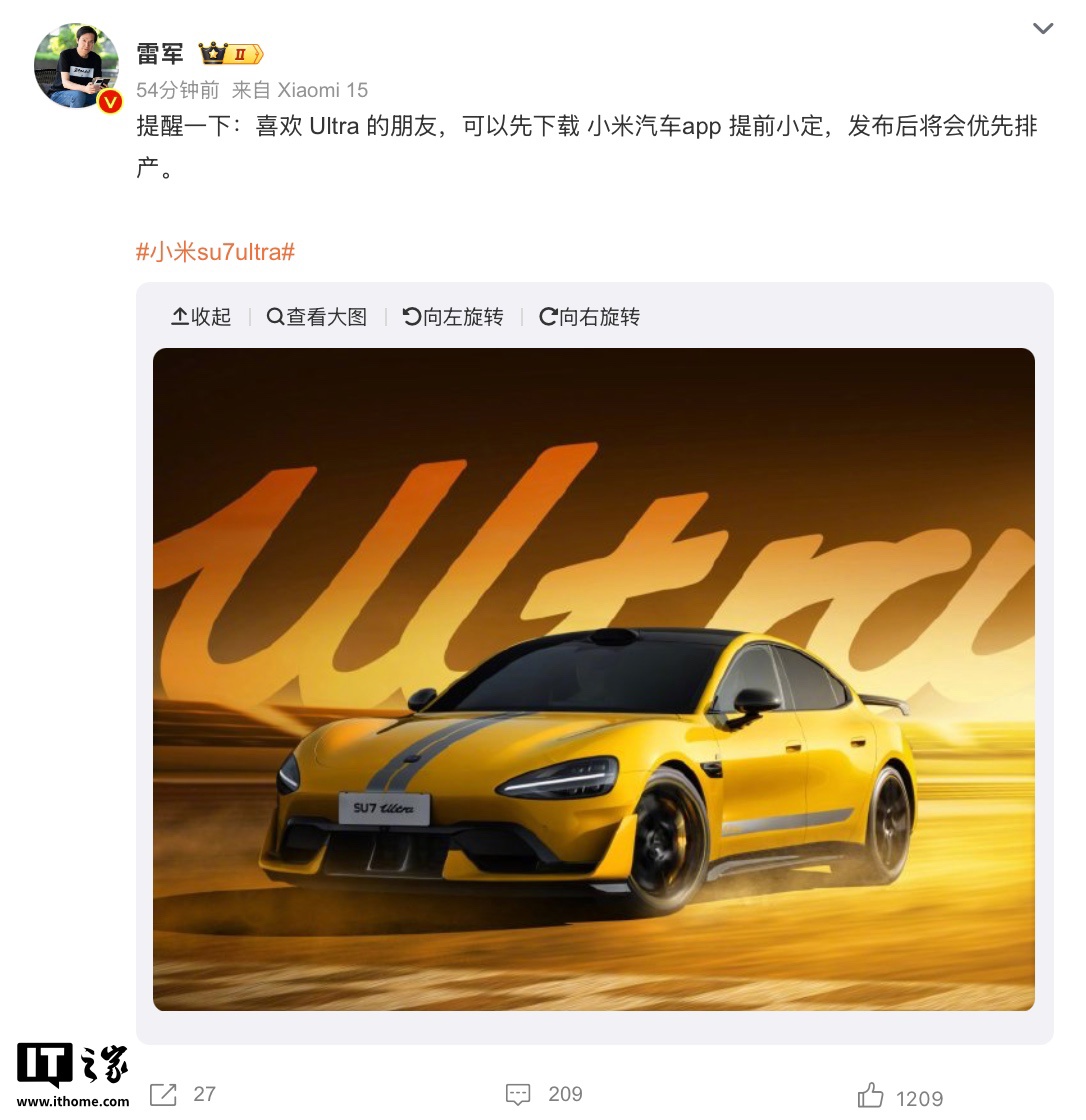 IT之家 2 月 23 日消息,小米雷军今天在微博发文,声称“喜欢 Ultra 的朋友,可以先下载小米汽车 App 提前小定,发布后将会优先排产”。