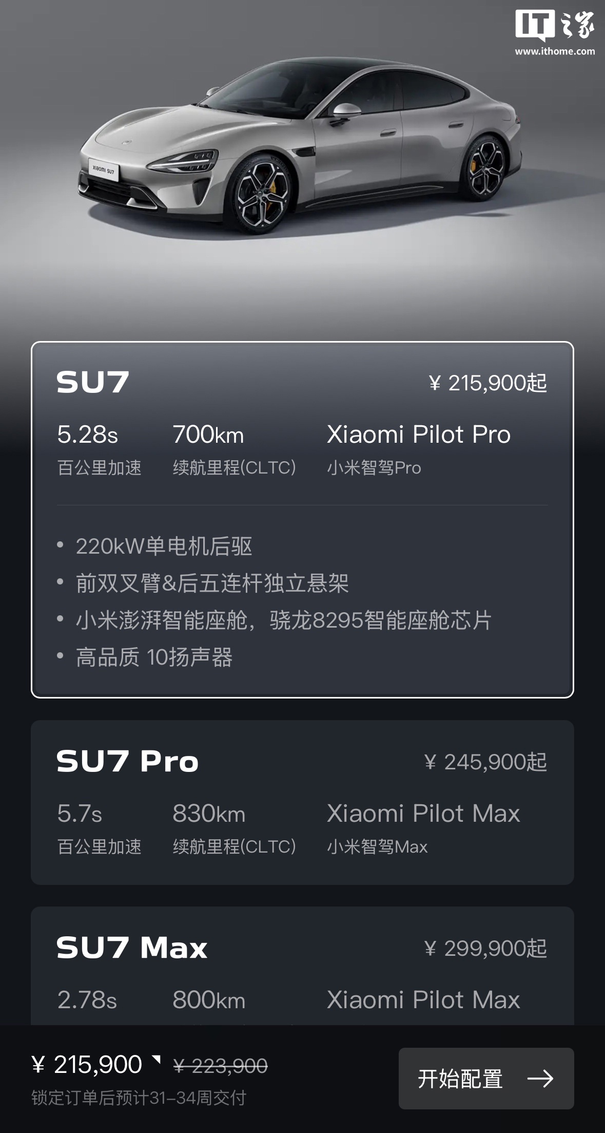 IT之家参考相应 App,其中显示目前小米 SU7 锁单后预计 31-34 周交付、SU7 Pro 预计 29-32 周交付、SU7 Max 预计 25-28 周交付。