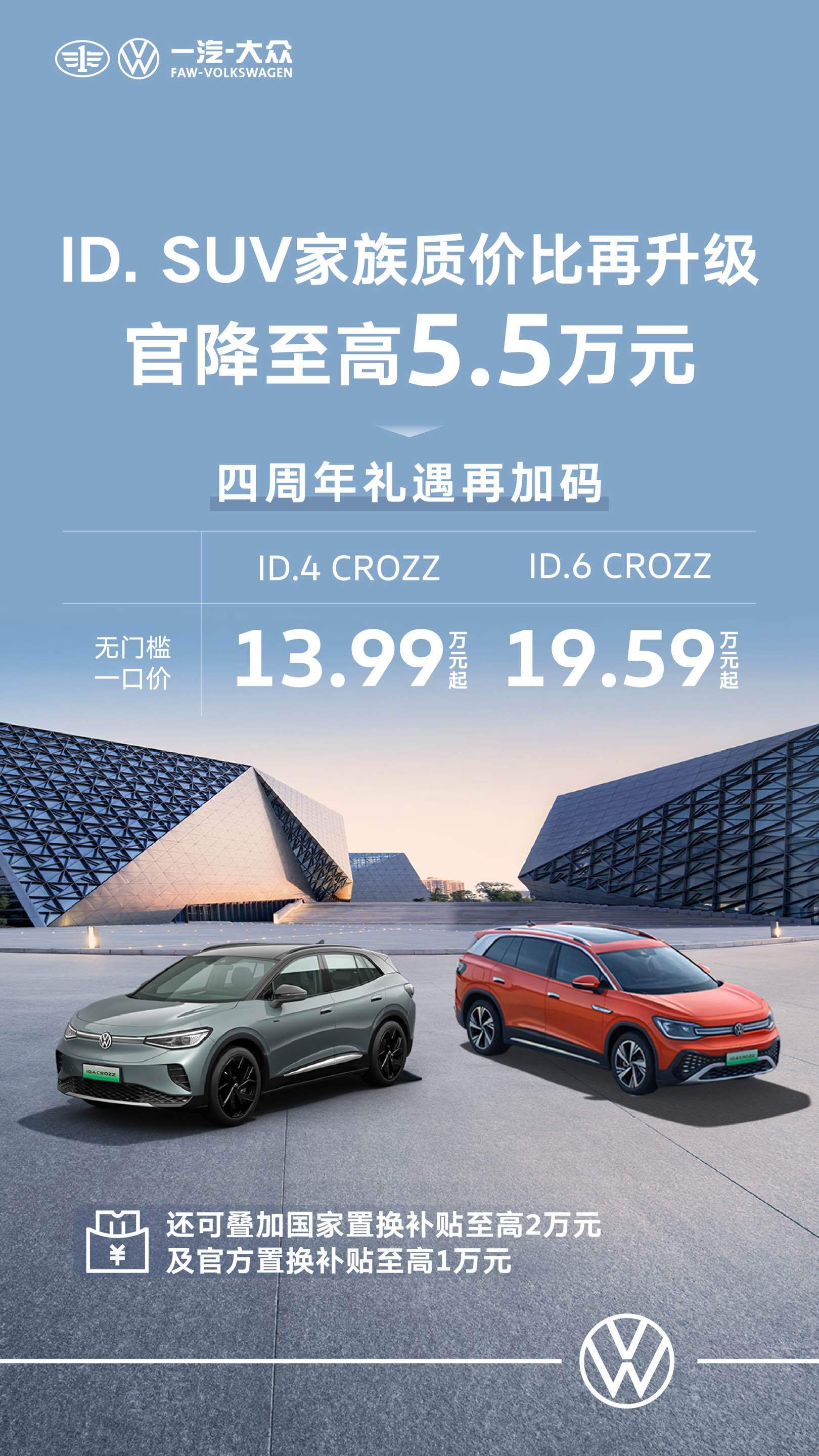 此次降价活动覆盖 ID.4 CROZZ 2025 款和 ID.6 CROZZ 两款车型,无门槛一口价 13.99 万元和 19.59 万元起,还可叠加官方置换补贴至高 1 万元、国家置换补贴至高 2 万元。