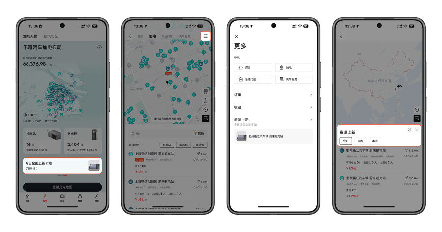 除了每周的推文,大家还可以通过乐道汽车 App > 加电页实时查看最新的换电站信息。在加电页,除了可以看到附近的加电资源外,继续往下滑动,或者在加电地图中点击右上角【资源上新】板块,就可以看到每天的站点和桩位资源上新情况,支持按日 / 周 / 月等不同时间维度筛选,帮助大家更便捷地掌握实时更新情况。