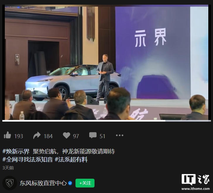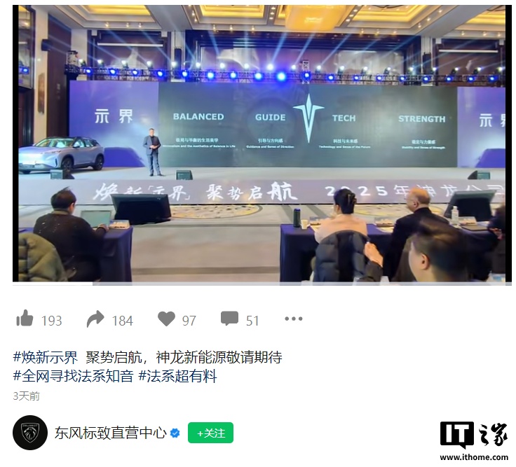 IT之家 2 月 24 日消息,在今年初的 2025 年神龙汽车经销商大会上,一款名为“示界”的新车名称 / 品牌曝光。该大会并没有公开披露信息,只是部分经销商近日展示了视频和图片。