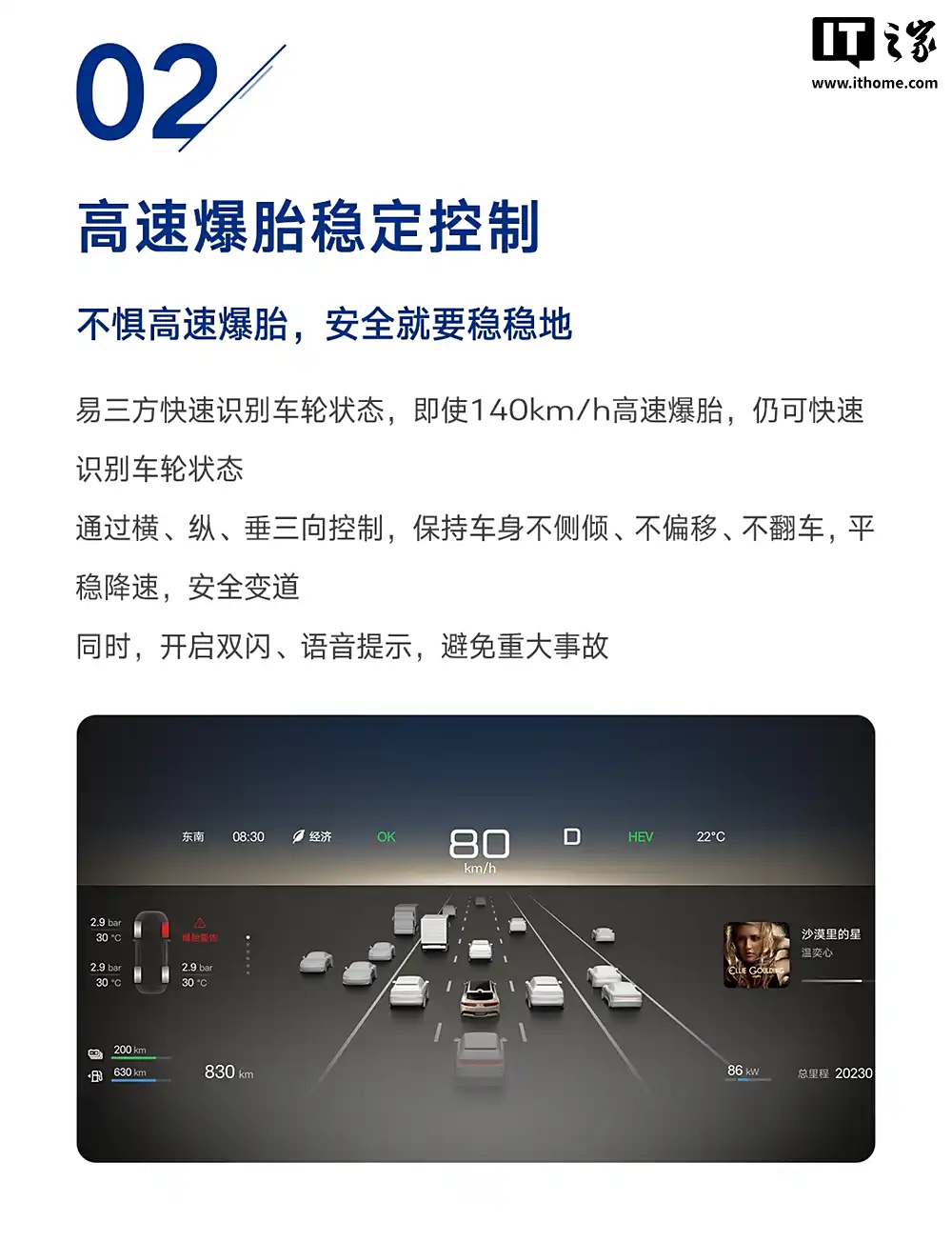 IT之家注意到,作为易三方平台的亮点功能之一,腾势 Z9GT 易三方泊车新增水平车位泊车。用户启动该功能后,泊车系统会智能测量泊车空间,规划最优入库路线,锁定单前轮并控制后双电机差动,车辆绕单轮旋转,帅气甩尾入位。而在安全性能方面,本次升级还引入了高速爆胎稳定控制功能,即使车辆在 140 公里 / 小时的高速行驶中遭遇爆胎,系统也能迅速感知轮胎状态,通过横、纵、垂三向控制,保持车身不侧倾、不偏移、不翻车,平稳降速,安全变道。同时,开启双闪、语音提示,避免重大事故。