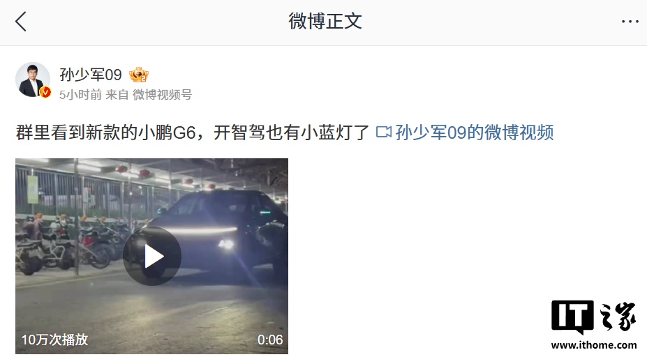IT之家 2 月 24 日消息,博主 @孙少军09 今日分享了新款小鹏 G6 汽车上路视频,并表示该车开启智驾将亮起小蓝灯。