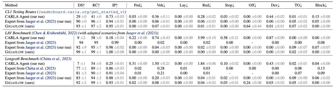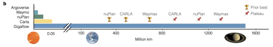 在基准测试中,GIGAFLOW策略的零样本泛化能力在三个主流自动驾驶基准上得到了验证,包括CARLA、nuPlan和Waymax。