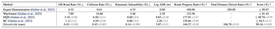 而在nuPlan和Waymax的基准测试中,GIGAFLOW策略展现了自然且鲁棒的驾驶行为。