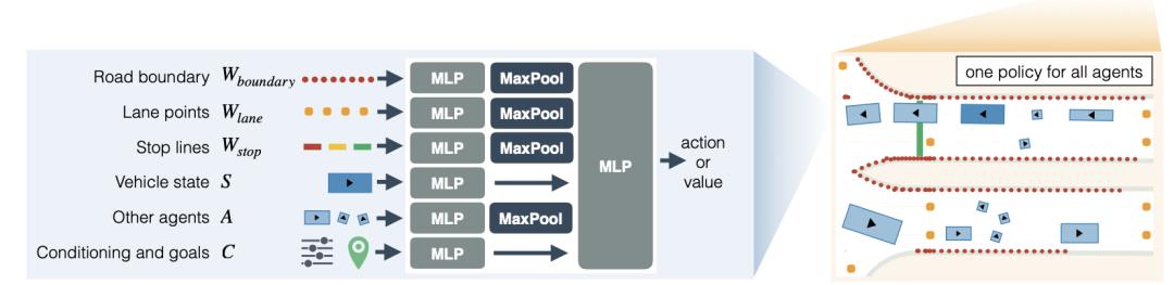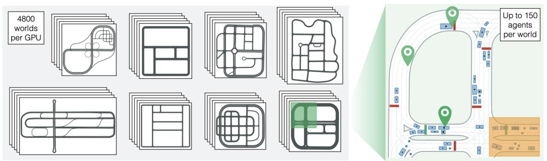 从交互决策的角度来看,这样的环境中最多可以同时存在150个智能体(包括车辆和行人等),所有参与者均由同一策略控制,但通过参数化条件展现出多样化的行为模式,如激进驾驶和守法驾驶等。
