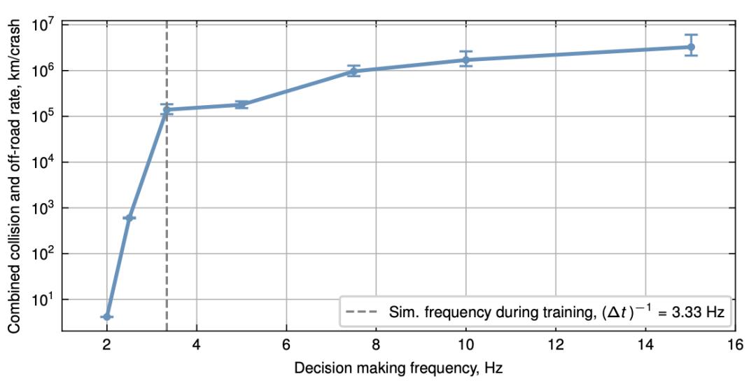 进一步分析表明,GIGAFLOW策略在长期驾驶鲁棒性方面也表现优秀,在降低动态噪声和提高控制频率的条件下,智能体平均可以连续驾驶1750万公里才发生一次事故,而美国人类驾驶者的平均事故发生率为每82.9万公里一次。