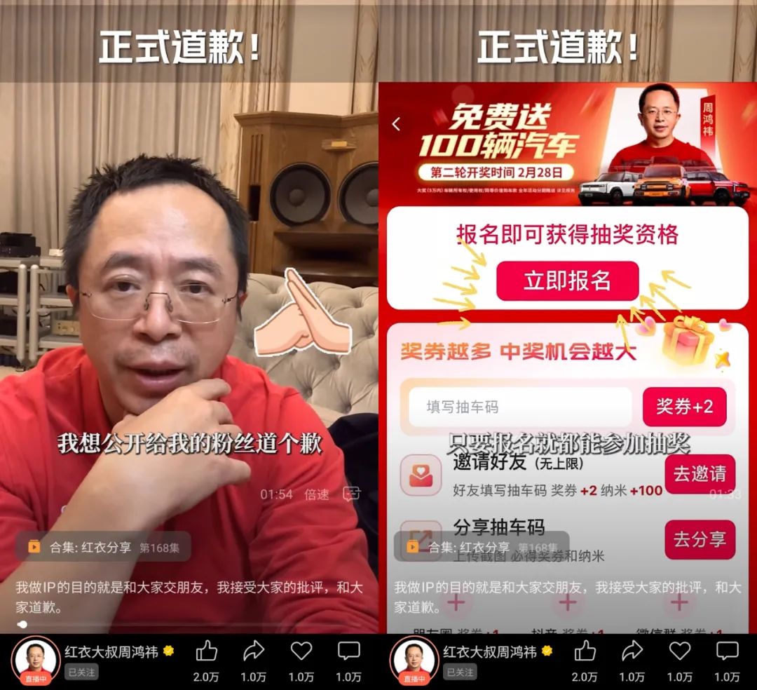 一个是周鸿祎。2月23日,周鸿祎做了一场交车仪式的直播,给参与抽奖送车的20位幸运儿,完成了第一轮“福利”的结算。这场直播,仅抖音和视频号平台在线总观看人数就超50万,弹幕里也挤满接好运的吃瓜群众。