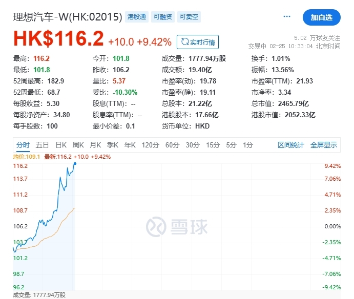 凤凰网科技讯 2月25日,理想汽车港股今日大涨,截至发稿,股价涨9.42%,报116.2港元。此前旗下首款电动SUV官宣,理想i8为首款车型。