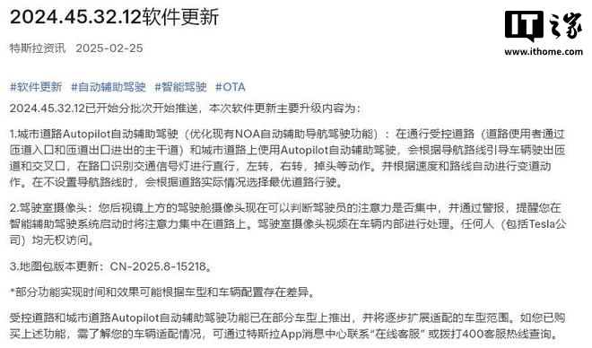 IT之家 2 月 25 日消息,特斯拉今日宣布,为中国客户分批次更新软件(2024.45.32.12)。其中包括,推出城市道路 Autopilot 自动辅助驾驶 (优化现有 NOA 自动辅助导航驾驶功能),在通行受控道路 (道路使用者通过匝道入口和匝道出口进出的主干道) 和城市道路上使用 Autopilot 自动辅助驾驶,会根据导航路线引导车辆驶出匝道和交叉口,在路口识别交通信号灯进行直行,左转,右转,掉头等动作,并根据速度和路线自动进行变道动作。在不设置导航路线时,会根据道路实际情况选择最优道路行驶。