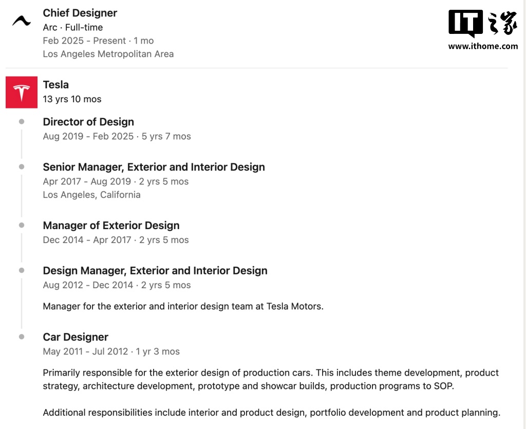 然而,Imai 于本月初确认,他已离开特斯拉,转而加入电动船制造商 Arc,担任首席设计师。IT之家注意到,他在领英(LinkedIn)上宣布了这一消息,表示希望将自己在设计领域的经验、领导力和热情带到新的工作岗位,助力 Arc 实现新的突破。