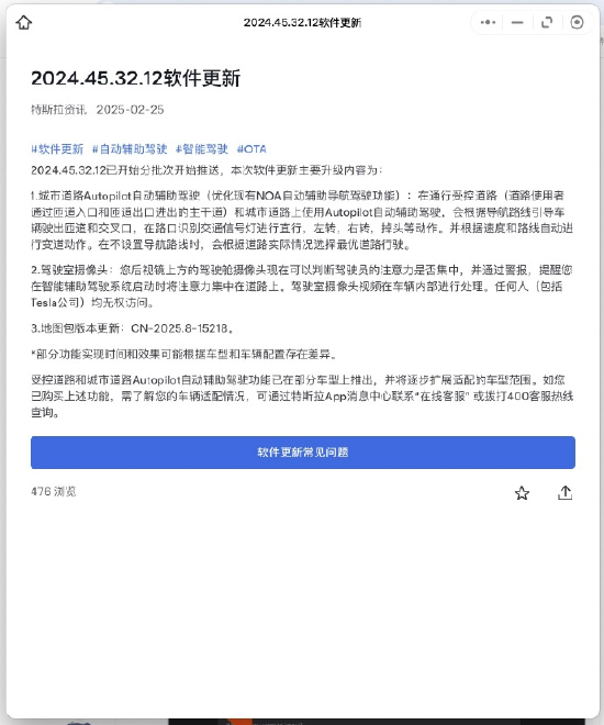 此外,特斯拉还更新了驾驶室摄像头,后视镜上方的驾驶舱摄像头现在可以判断驾驶员的注意力是否集中,并通过警报,提醒您在智能辅助驾驶系统启动时将注意力集中在道路上。驾驶室摄像头视频在车辆内部进行处理。任何人(包括Tesla公司)均无权访问。