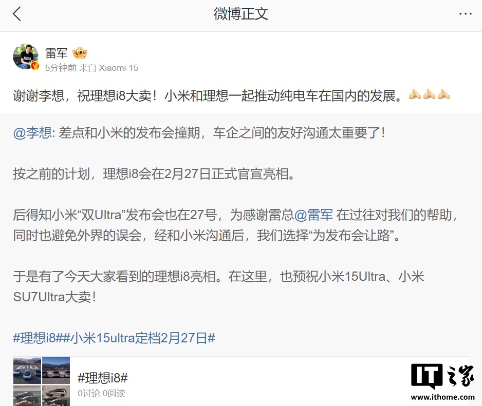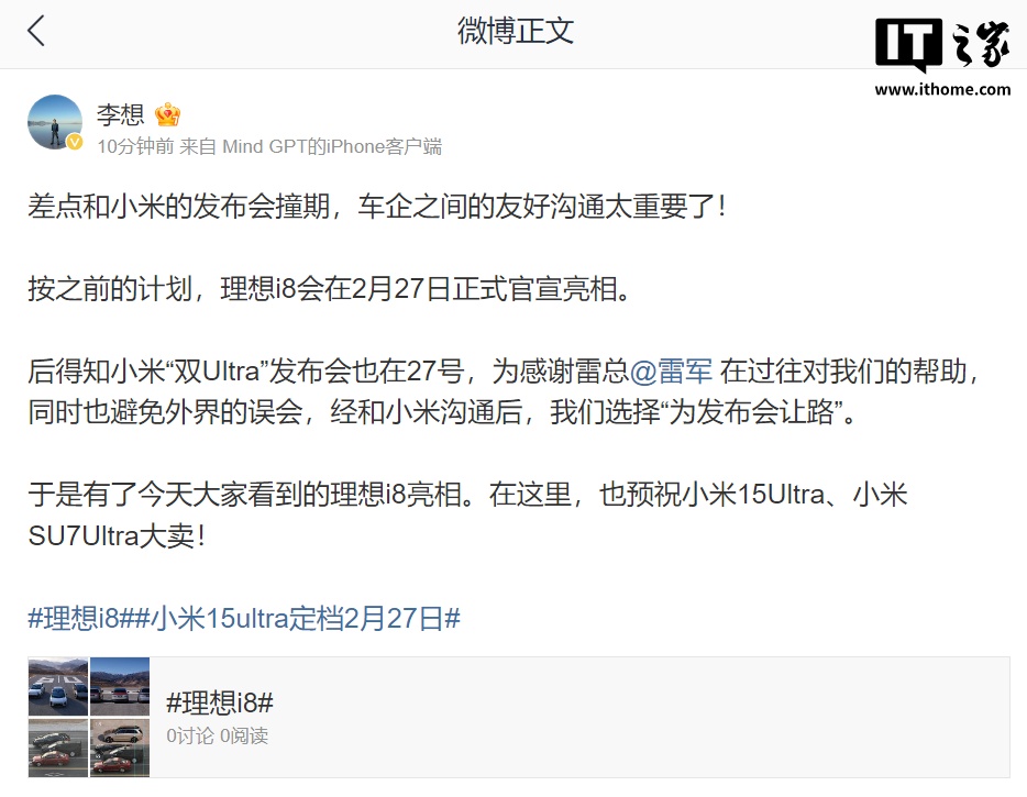 IT之家 2 月 25 日消息,理想汽车董事长兼 CEO 李想今日发文,透露理想 i8 官宣差点和小米“双 Ultra”发布会撞期,IT之家附全文如下: