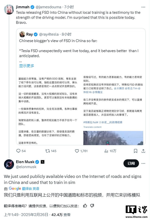IT之家注意到,特斯拉 CEO 埃隆・马斯克(Elon Musk)在回应用户反馈时表示,特斯拉通过视频训练的方式,使得 FSD 系统能够快速适应中国的道路标志和交通法规。他指出,特斯拉利用公开的网络视频资源进行了模拟预训练。
